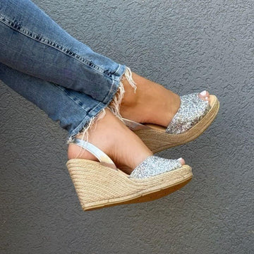 Klassische Espadrille-Keilsandalen in Champagner-Glitzer